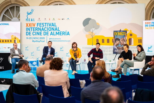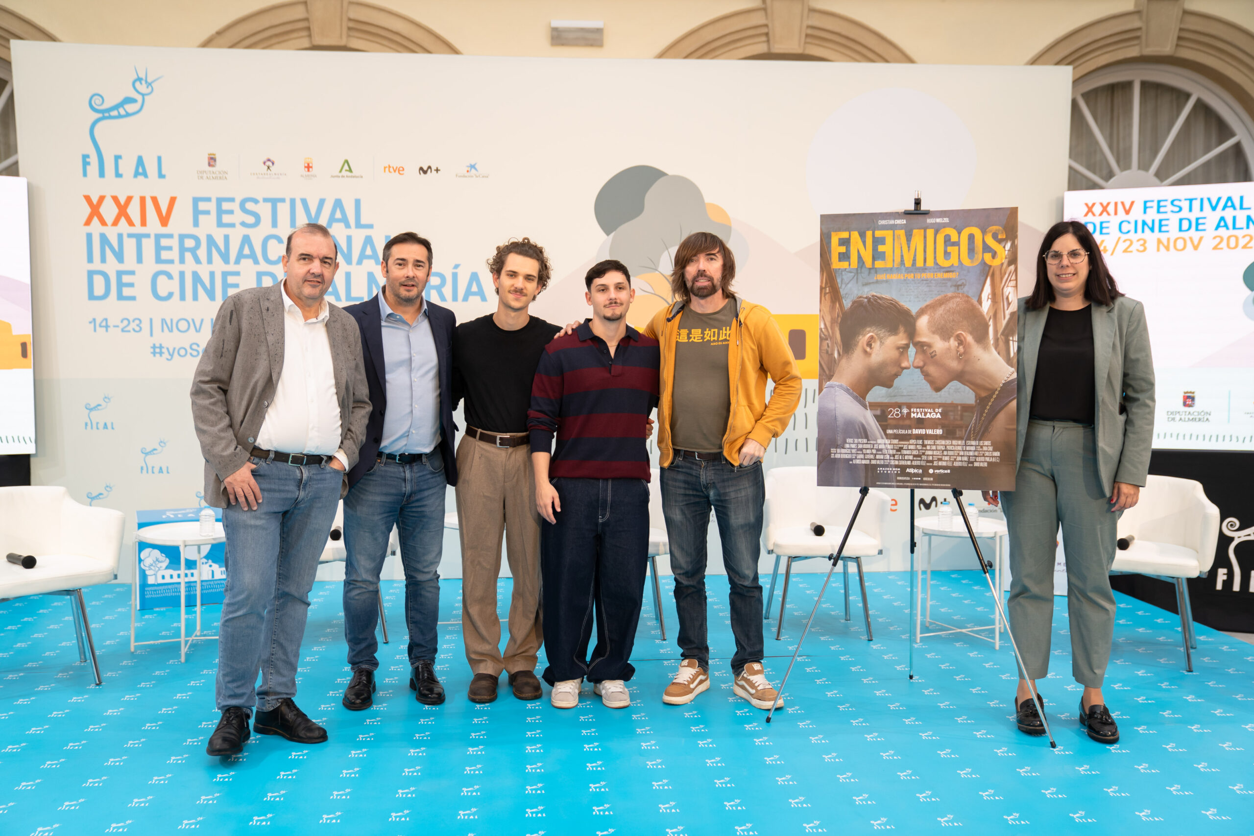 “En todos los barrios hay un ‘El Rubio’, alguien que atemoriza a los demás niños y jóvenes, y en el mío también. Indagué y esa agresividad procedía del odio a su padre. Es el germen de la historia”. Con estas palabras el director, David Valero, ha explicado del viaje emocional que se experimenta en su ópera prima ‘Enemigos’, y lo ha hecho arropado por los dos protagonistas, Christian Checa, que interpreta el papel de Chimo, el joven acosado, y Hugo Wetzel, ‘Rubio’ en este largometraje. También le han acompañado el productor, Alberto Félez, de Atípica Producciones, la diputada de Cultura y Cine, Almudena Morales, y el director de FICAL, Enrique Iznaola.