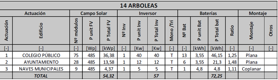 Se ha llevado a cabo la ejecución de la obra de “INSTALACIONES DE GENERACIÓN ELÉCTRICA RENOVABLE PARA AUTOCONSUMO EN EL MUNICIPIO DE ARBOLEAS. PROGRAMA DUS 5000” perteneciente a la medida 2 a la que se refiere el art. 9 del Real Decreto 692/2021.