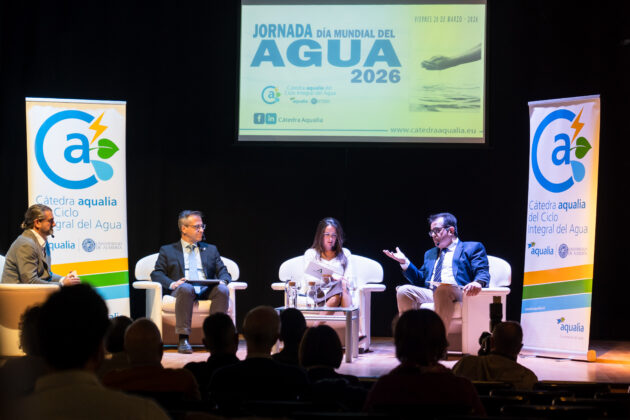 Bajo el lema «Almería, pasado, presente y futuro del agua», el bloque central de la jornada consistió en una mesa redonda moderada por Jose Colomina, co-director de la Cátedra Aqualia, en la que se debatieron políticas de planificación, sostenibilidad e infraestructuras estratégicas, así como la necesidad de adaptación al cambio climático y de colaboración interadministrativa.