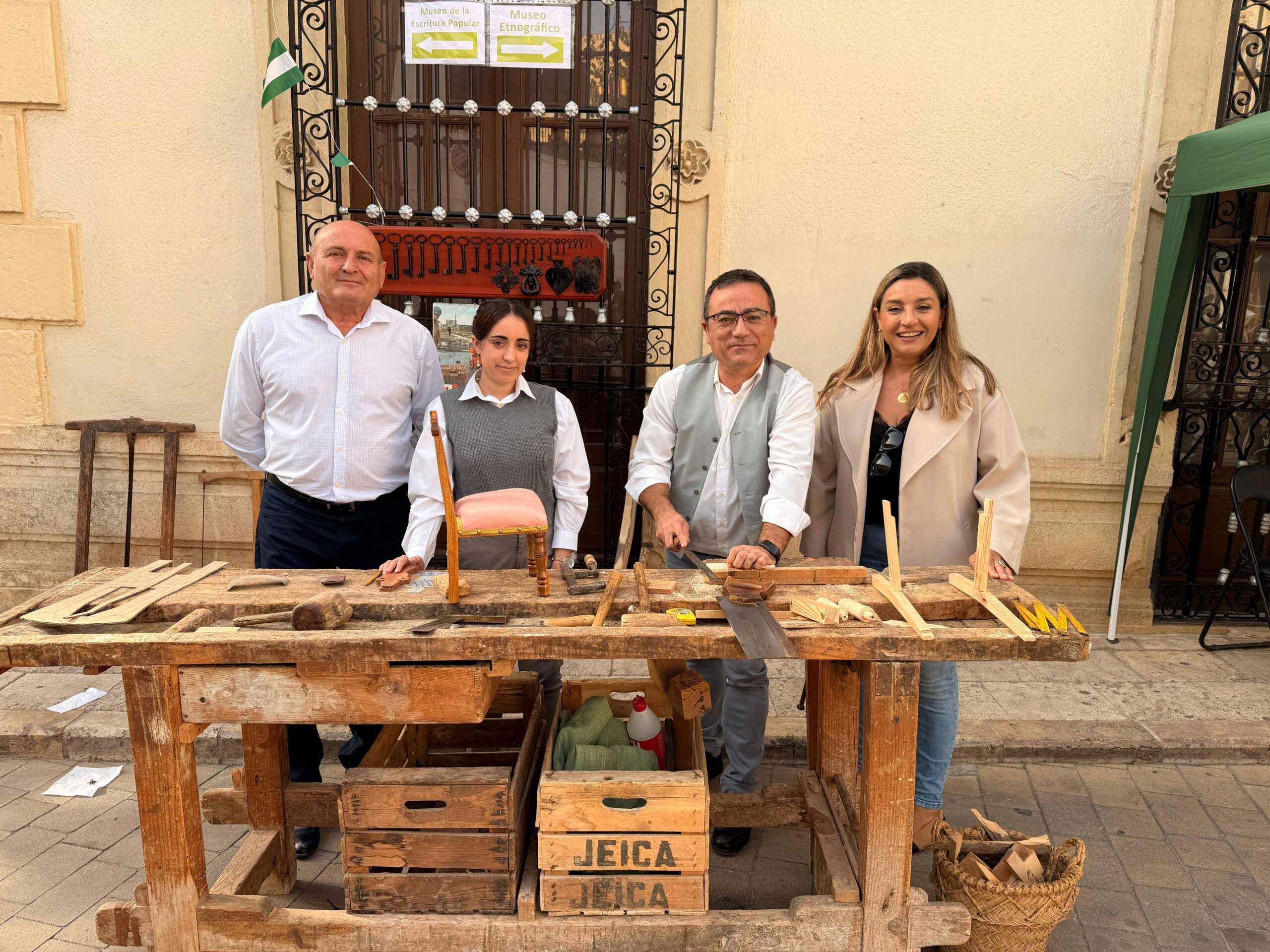 La diputada María del Mar López, junto al alcalde de municipio y el organizador de la muestra, inaugura esta jornada que revive los oficios tradicionales de la provincia
