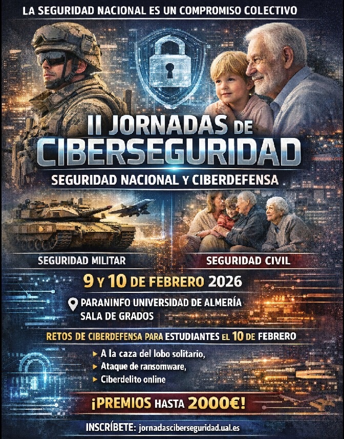 La Universidad de Almería acogerá los próximos días 9 y 10 de febrero las II Jornadas de Ciberseguridad: Seguridad Nacional y Ciberdefensa, un evento de referencia que nace con el firme propósito de crear conciencia y comunidad frente a las crecientes amenazas que atentan contra una esfera digital cada vez más vinculada a la vida personal y privada. Dirigido a toda la sociedad, el evento contará con la participación de expertos de las fuerzas y cuerpos de seguridad, fiscalía y empresas tecnológicas líderes que compartirán su conocimiento y experiencias.