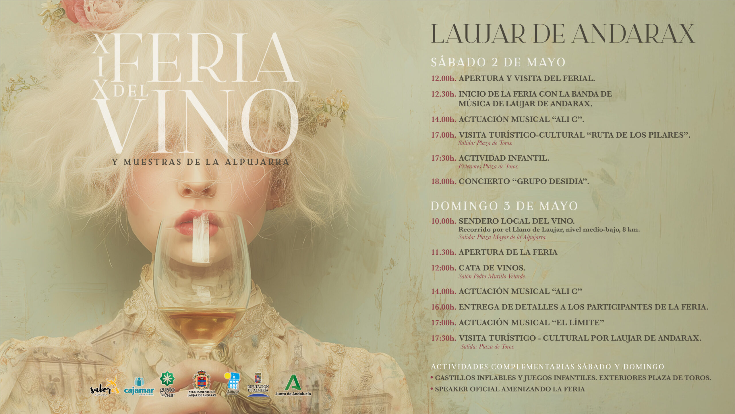 La alcaldesa ha detallado la programación y ha destacado que hemos preparado una programación muy diversa para esta edición. “Contamos con más de 25 stands donde no solo participan bodegas, sino que también cobra protagonismo la gastronomía local y de la comarca: quesos, embutidos, dulces y aceites de Laujar y alrededores, muchos de ellos bajo el sello de calidad ‘Sabores Almería’”.